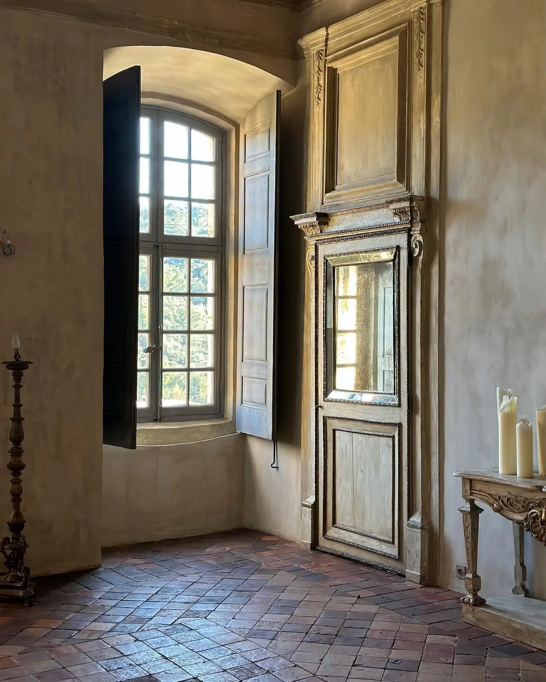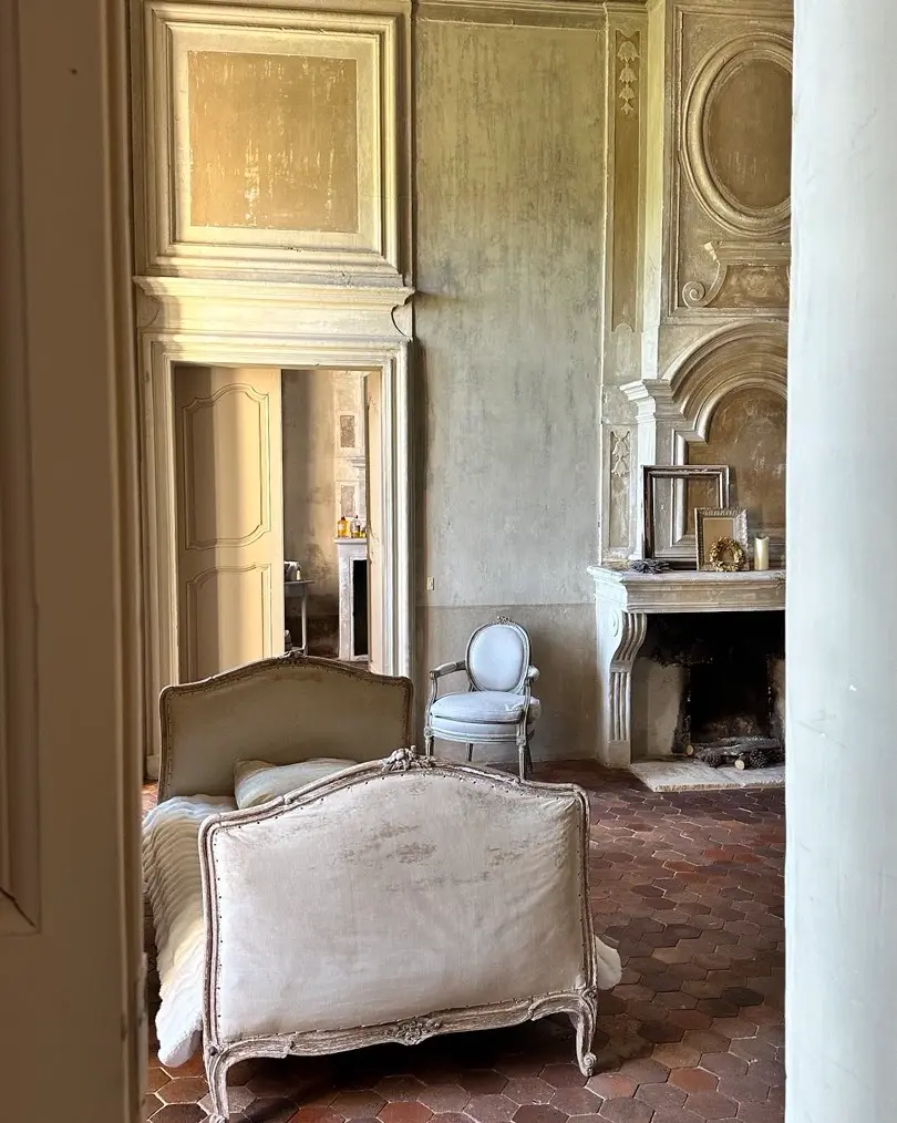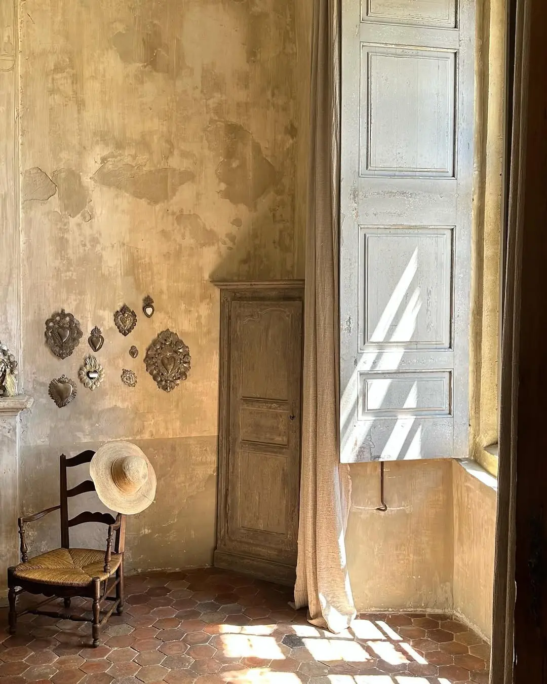 As for decoration, lean into what feels sacred yet lived-in. Church-like taper candles placed in aged urns or vintage candlesticks; linen drapes that catch the light; 18th- or 19th-century botanical prints in weathered frames; votive offerings or ex-votos as wall adornments (I love the ones from Bonnesoeurs). I love the idea of reusing old wine bottles as candleholders, or placing terracotta pots and ceramic vases throughout the space like quiet offerings. Let the walls breathe, bare or painted in muted, chalky tones. If you’re lucky enough to have terracotta tiles (tomettes) underfoot, let them shine; if not, a well-placed sisal rug or aged wood can echo the warmth.