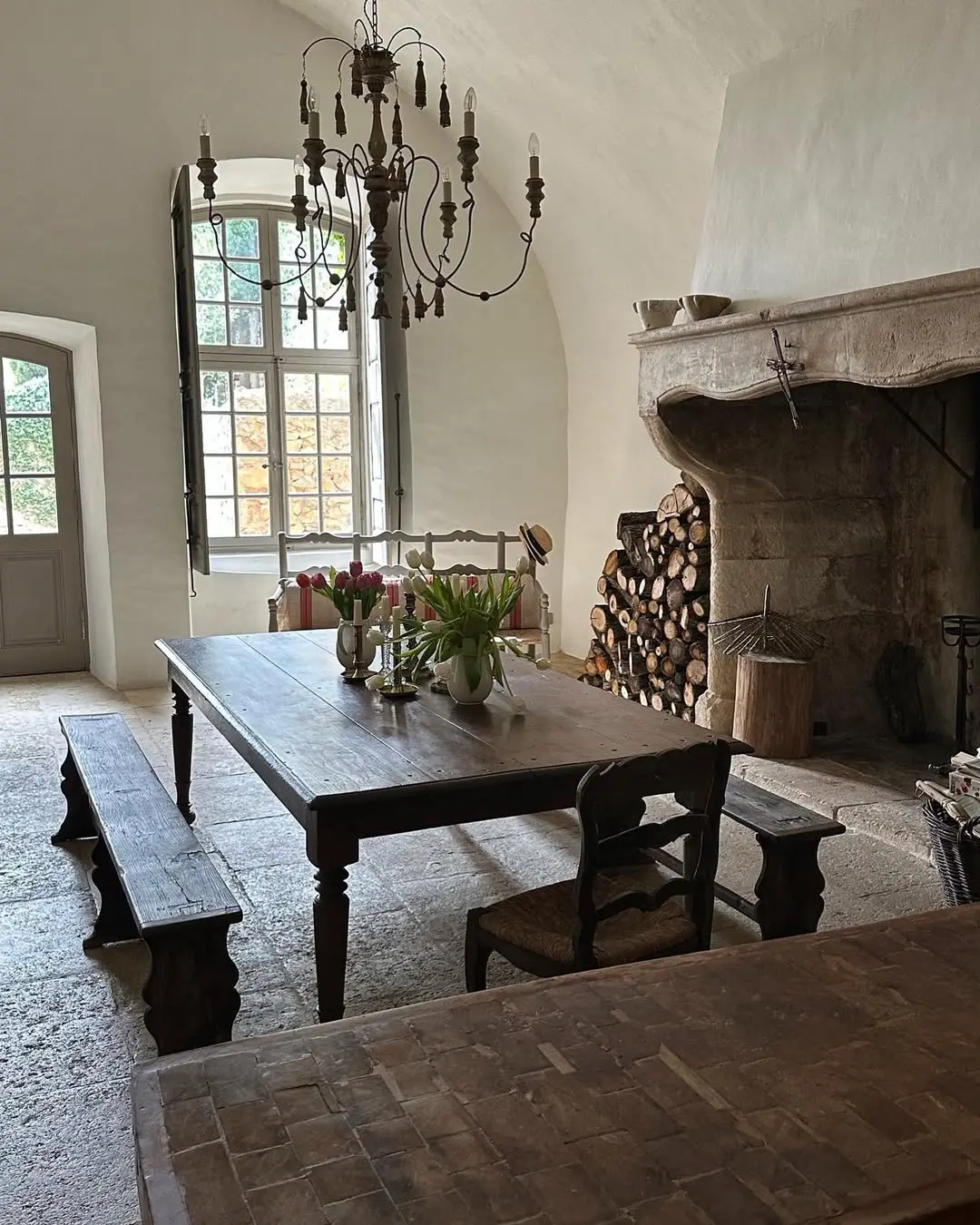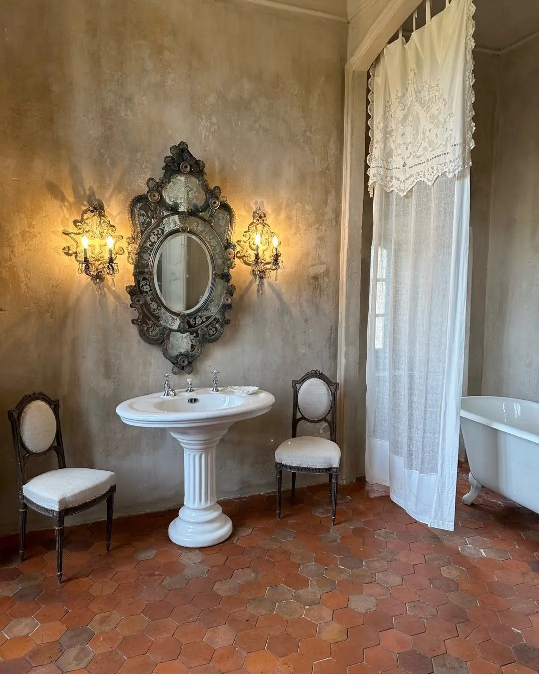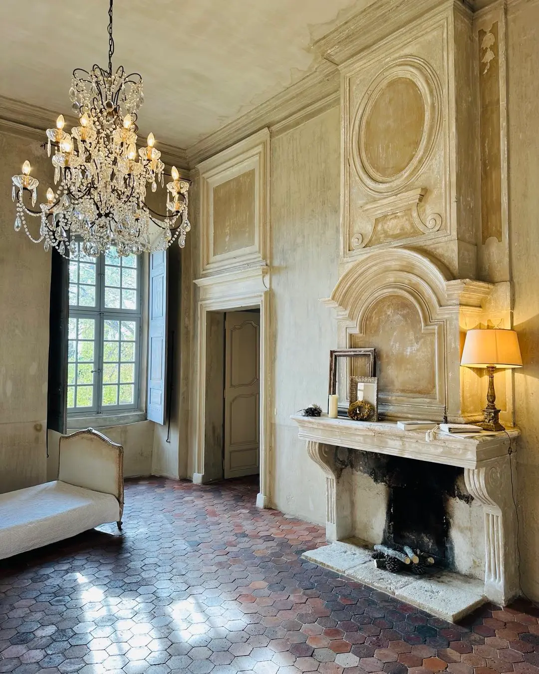 As for decoration, lean into what feels sacred yet lived-in. Church-like taper candles placed in aged urns or vintage candlesticks; linen drapes that catch the light; 18th- or 19th-century botanical prints in weathered frames; votive offerings or ex-votos as wall adornments (I love the ones from Bonnesoeurs). I love the idea of reusing old wine bottles as candleholders, or placing terracotta pots and ceramic vases throughout the space like quiet offerings. Let the walls breathe, bare or painted in muted, chalky tones. If you’re lucky enough to have terracotta tiles (tomettes) underfoot, let them shine; if not, a well-placed sisal rug or aged wood can echo the warmth.