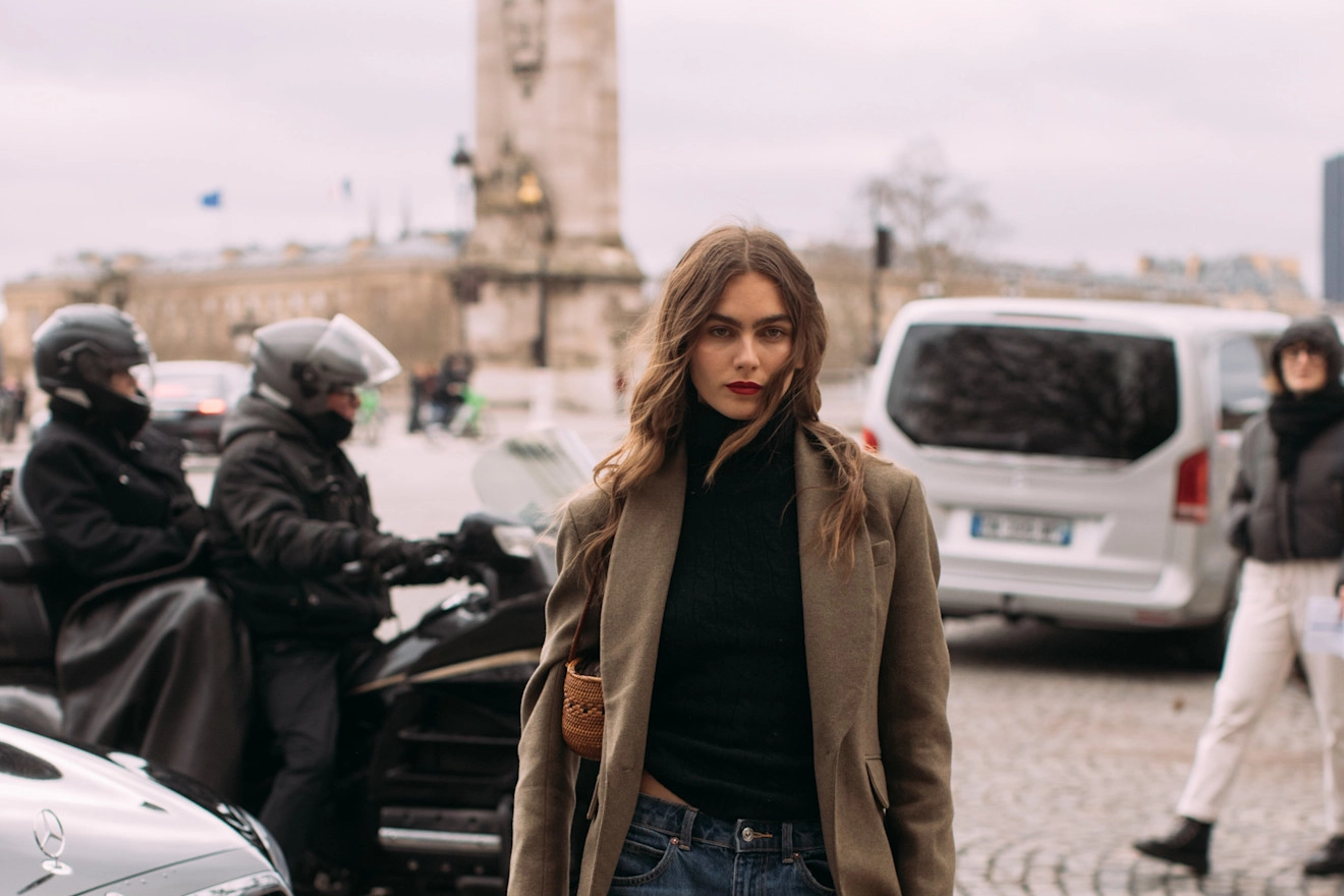 A khaki wool blazer, styled over a black turtleneck, mid-rise wide-leg jeans, and suede boat shoes, embodies a casual-chic aesthetic that feels quintessentially Parisian. This season, I’m loving this Micro-houndstooth tailored jacket from Mango, which pairs beautifully with these mid-rise wide-leg jeans from Massimo Dutti (a personal favorite!) and these suede boat shoes from Everlane.