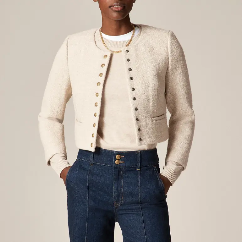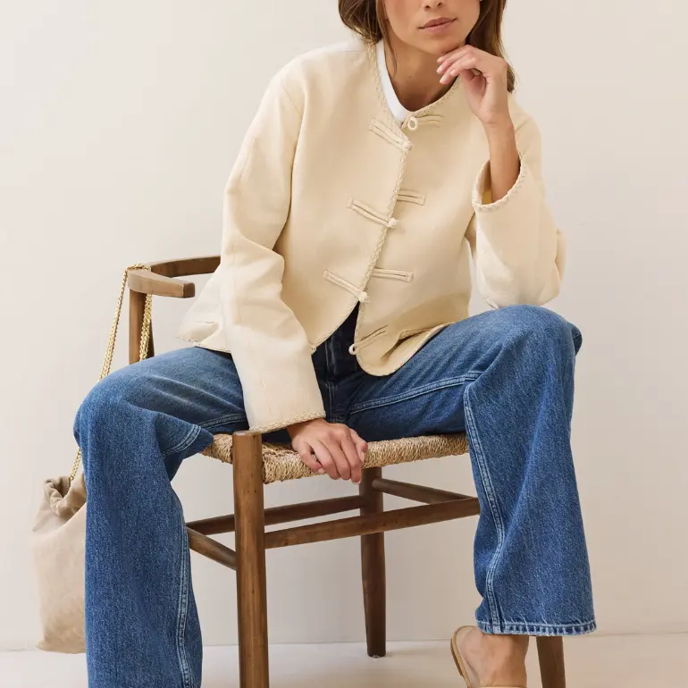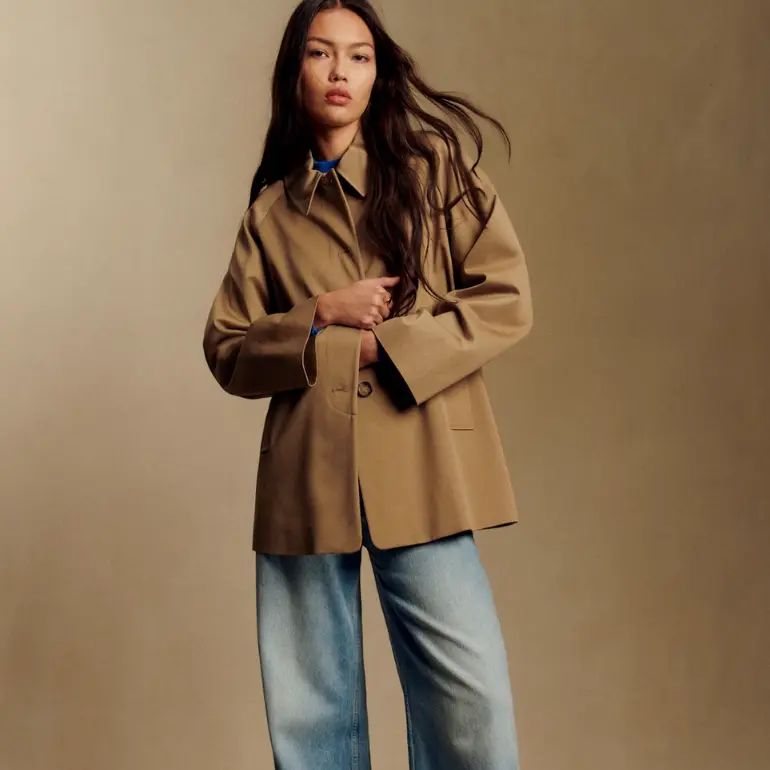 The navy jacket with gold buttons featured above (Sandro’s Round Collar Jacket, currently on sale) is a perfect example. Structured yet unfussy, it has that rare ability to make denim and simple flats feel immediately polished.