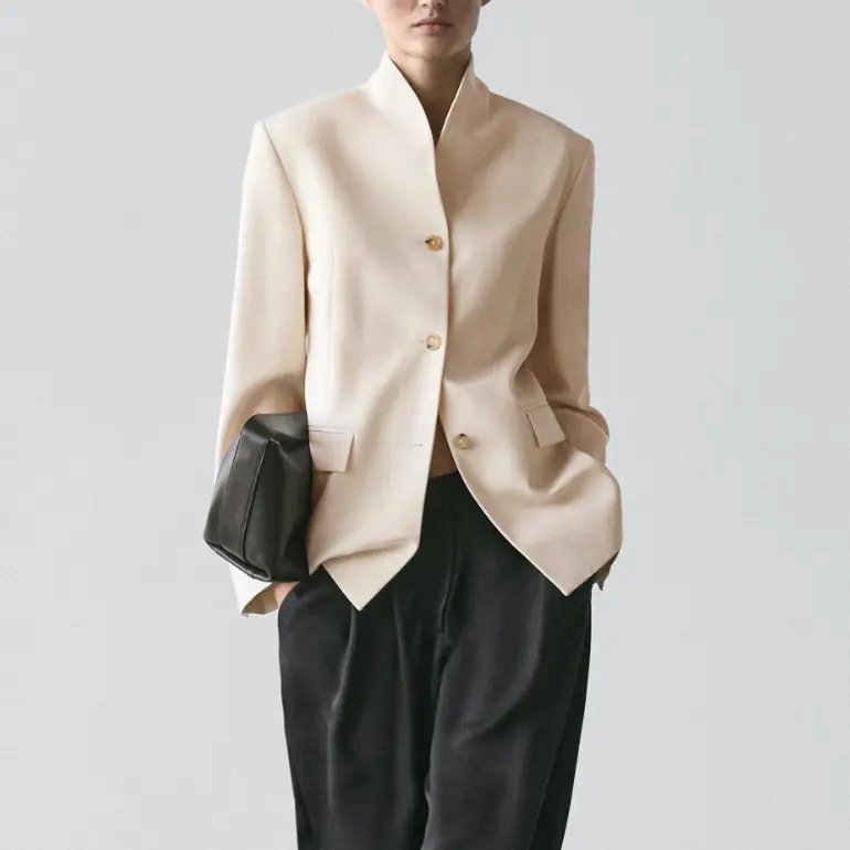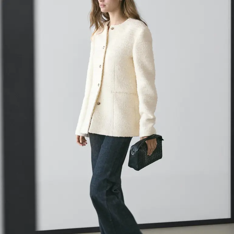A white jacket introduces clarity. With its defined collar and subtle gold buttons, it frames the silhouette beautifully, elevating a simple t-shirt and jeans without effort.