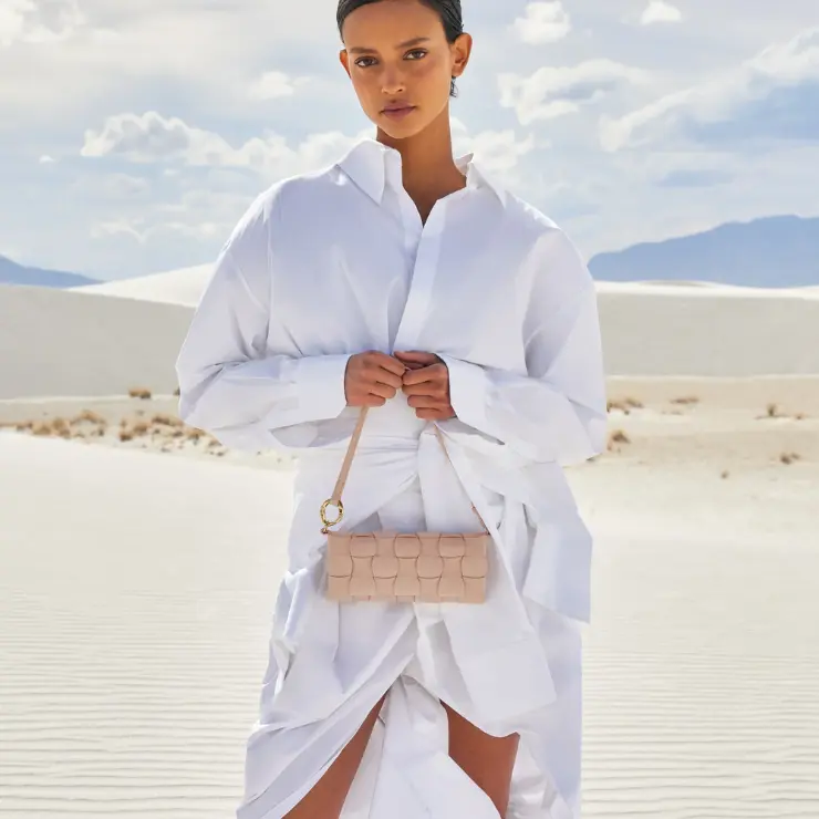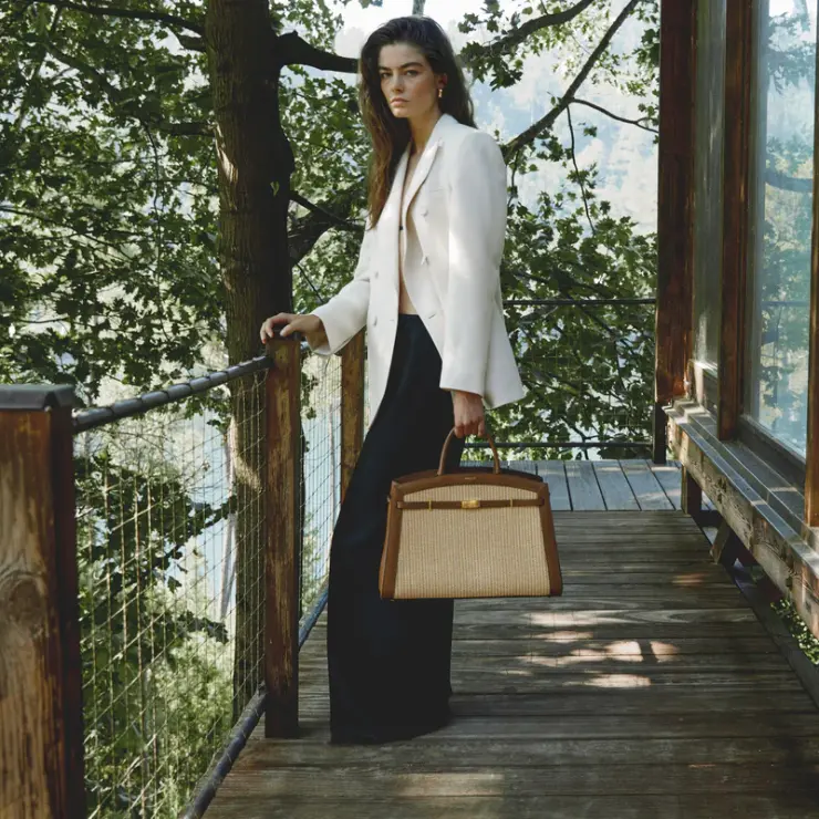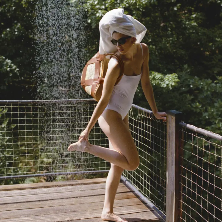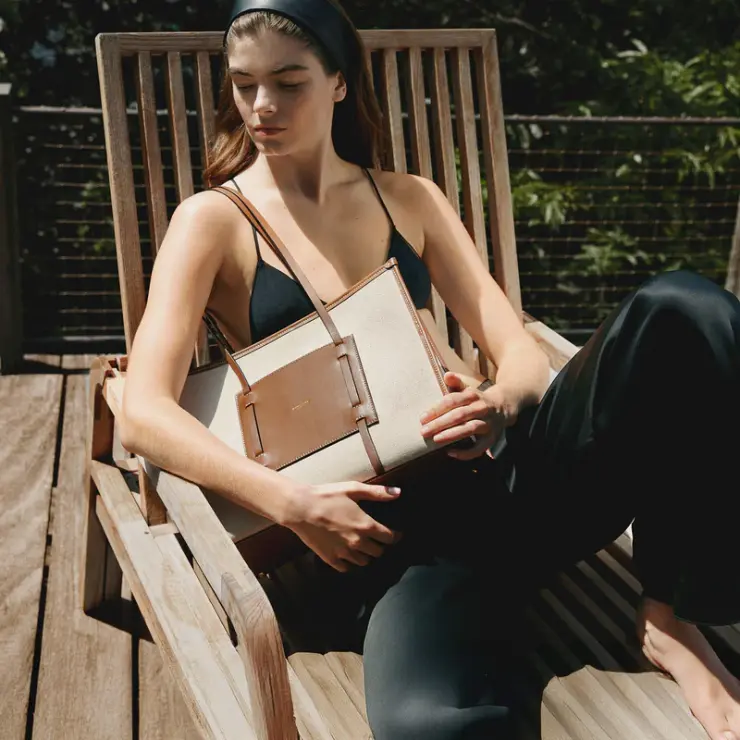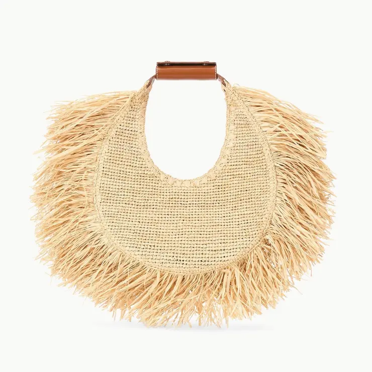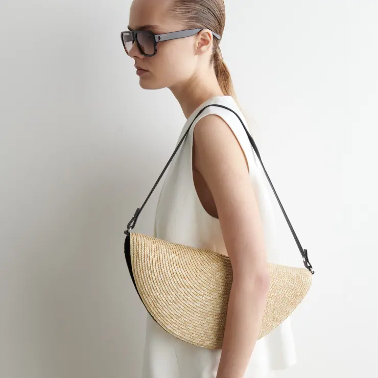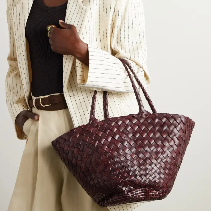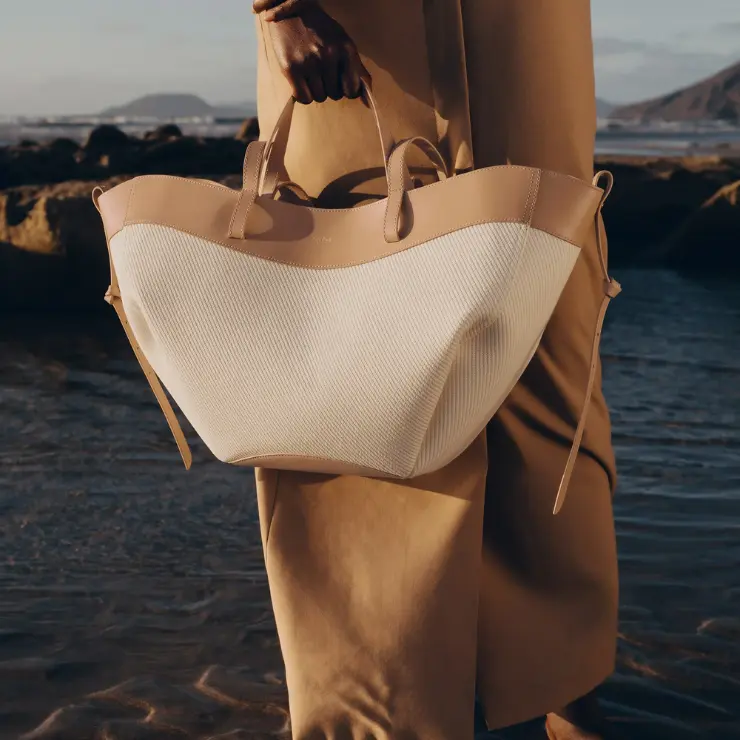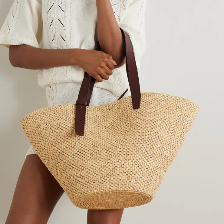For summer in the city or for work, I’d recommend two types of bags this season: a canvas bag with leather details, or a woven leather bag, both of which are incredibly on-trend right now. And if you really love raffia, one of the only bags I’d consider office-appropriate is The Hudson from DeMellier. Its structured shape is beautifully reminiscent of The Row’s signature style.