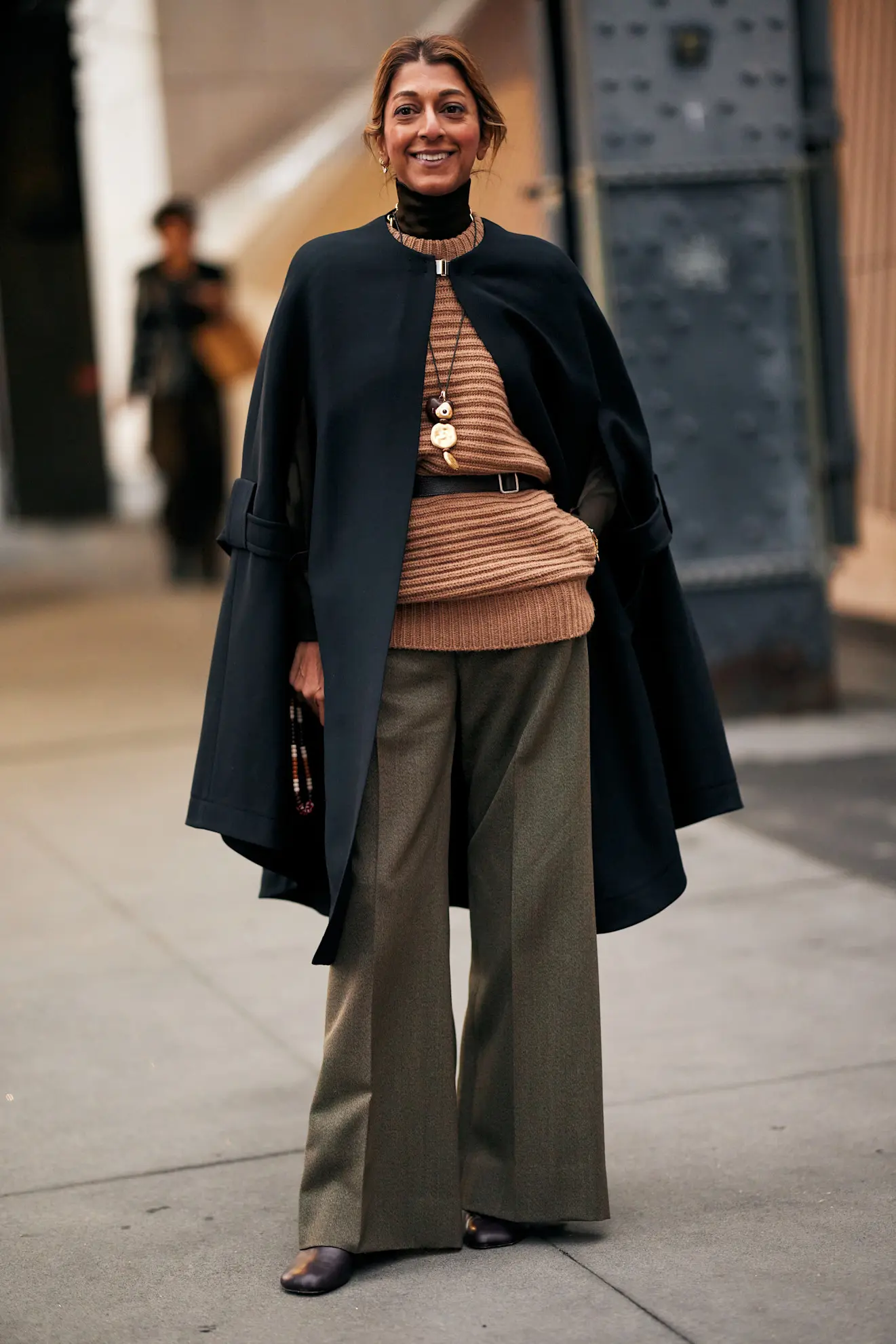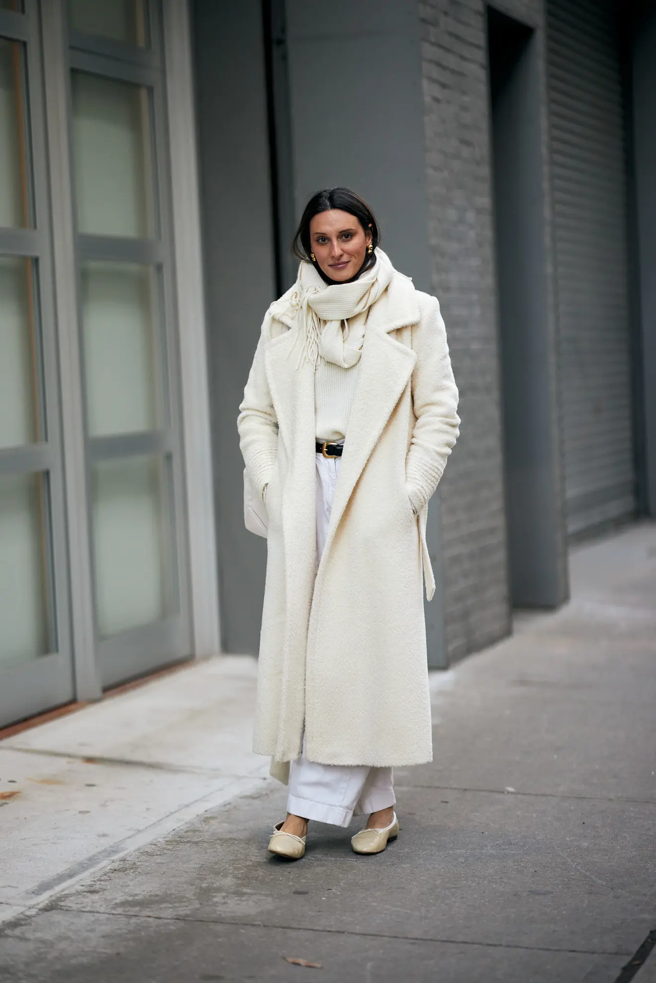 On the agenda: the return of fine turtlenecks layered beneath blazers, sky-blue poplin shirts (like The Tate from AYR or this version from Massimo Dutti), and crisp white T-shirts worn under tailored jackets. Long coats remain essential, from cape styles inspired by Chloé (I spotted a beautiful wool-blend version in camel) to soft monochrome ensembles in off-white (this ivory one by Loulou de Saison is especially chic), and timeless wool overcoats in navy, camel or black, some softly rounded at the shoulders, others sharply structured (like this iconic silhouette from Totême).