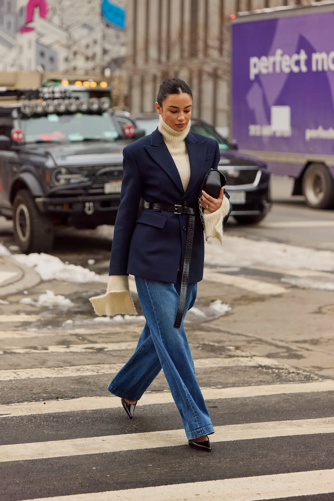 As for blazers, the silhouette this season falls just right, neither too fitted nor too oversized, in rich solids like burgundy or deep navy, or in plaids and soft grey pinstripes. A cinched waist, often with a belt, brings definition and quiet sophistication. Prints are also appearing on trousers: plaids, fine stripes, and tailoring with subtle character. Denim silhouettes are evolving: wide-leg, flared (I’m fond of AYR’s Secret Sauce), and even barrel-leg styles, like The Getup, which recall the Céline runways of recent seasons.