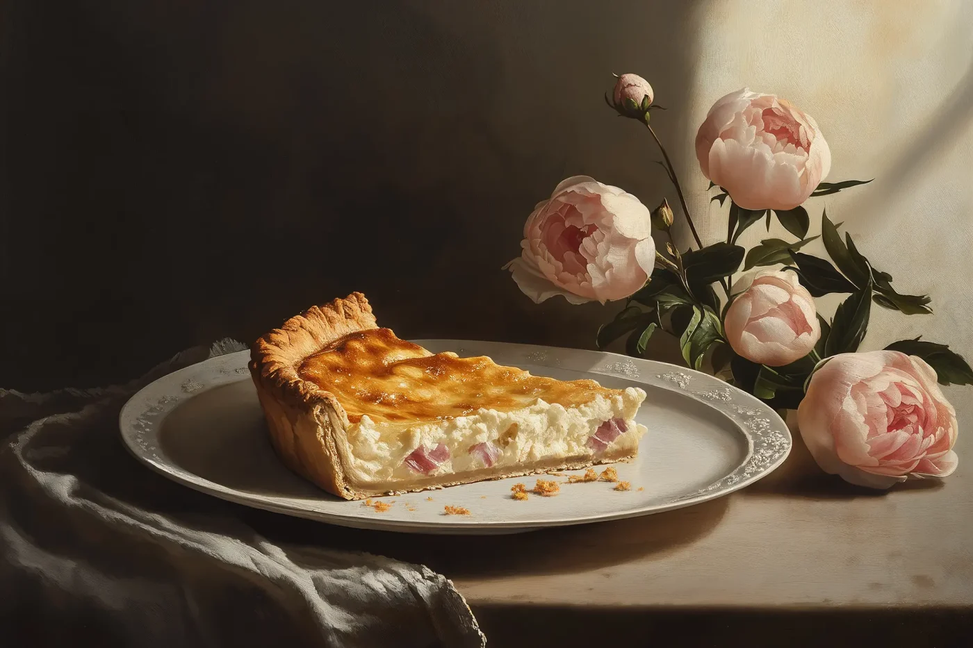 - Pour the mixture over the lardons in the tart shell. Bake for 10 minutes at 400°F (200°C), then reduce the temperature to 350°F (180°C) and bake for an additional 20–25 minutes, or until the filling is set and golden.